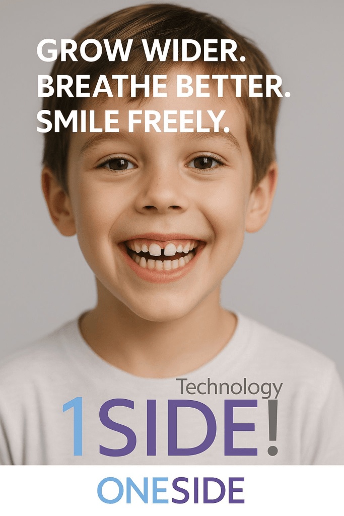 Developed by 1SIDE Technology and protected by international patents, this invisible and removable device gently and progressively expands the upper jaw, improving dental alignment, breathing, and oral function.